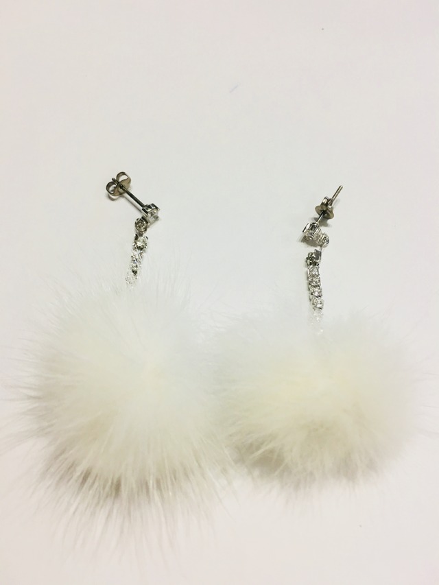 チタン製のピアスにジルコニアが光るピアスにスワロフスキー連爪チェーン、その先にはふわふわのミンクボール。 秋冬のマストアイテムです。 全長約6センチ。