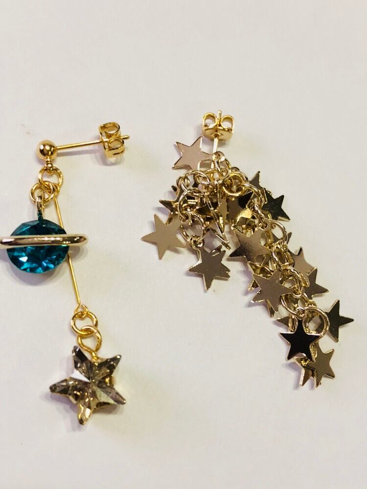 片方は流星群をイメージした星たちがゆらゆら。アシンメトリーなピアス。