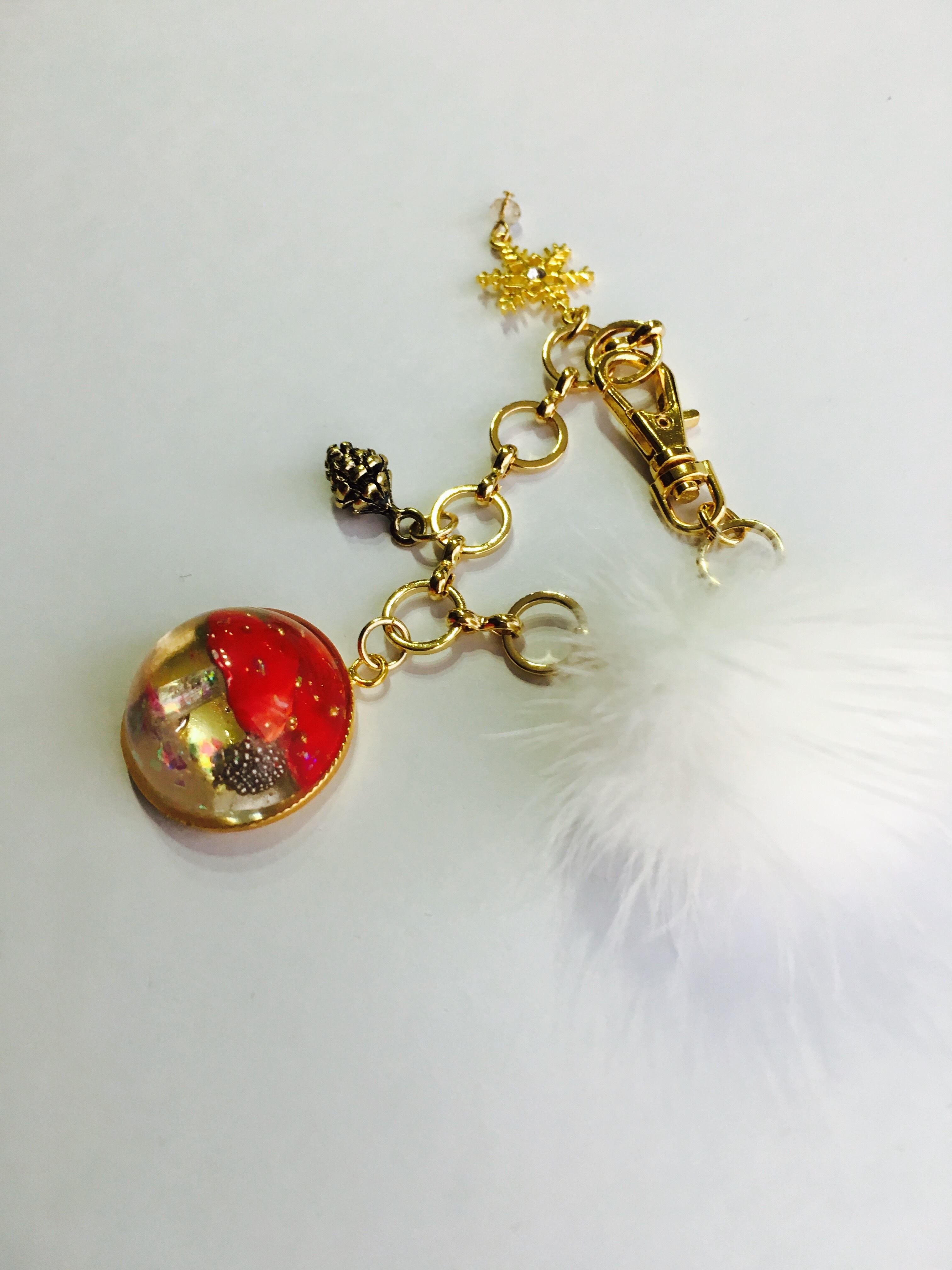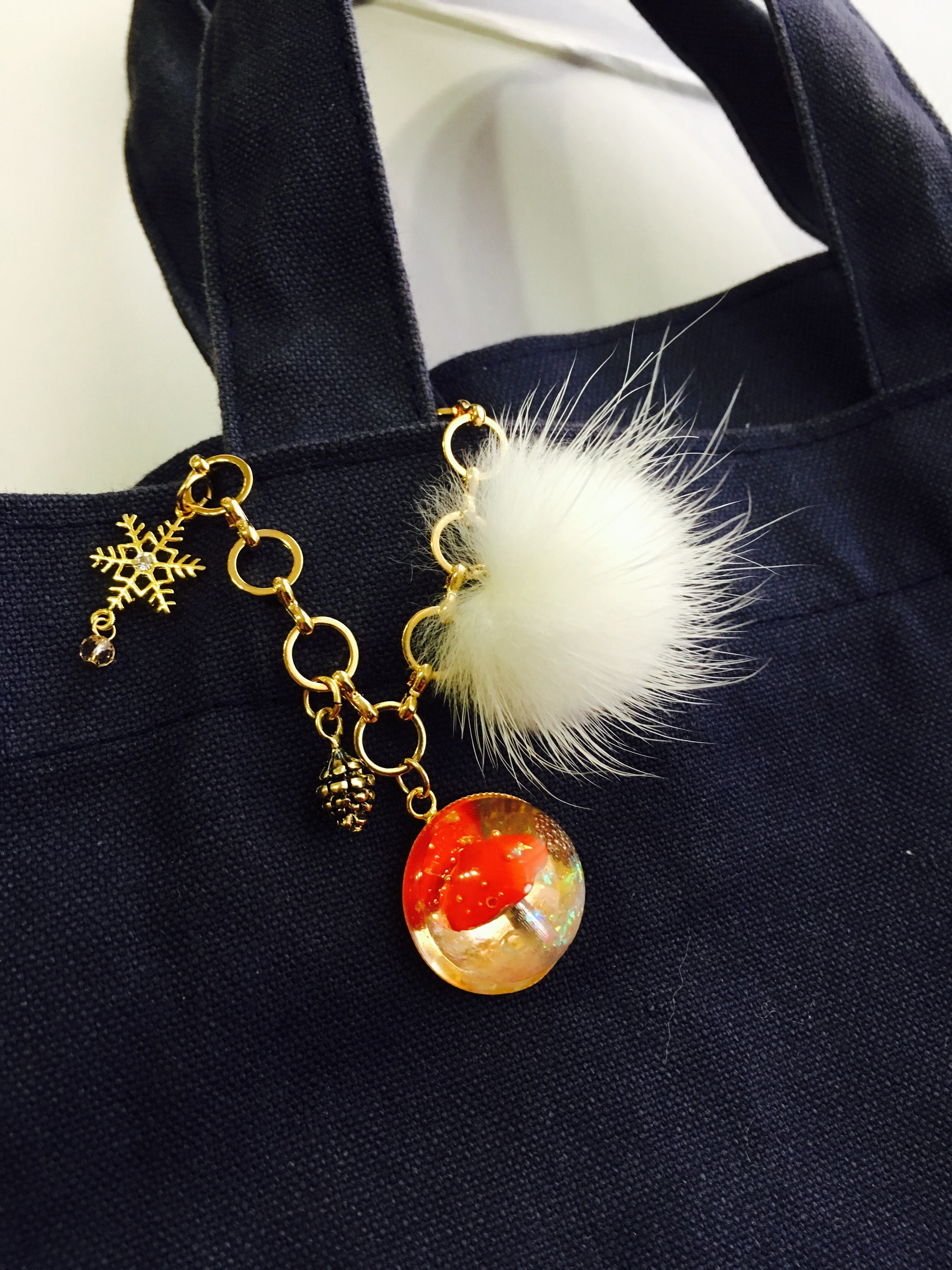 スノードームのようなチャーム、ミンクボール、松ぼっくり、スノーフレークがついたバッグチャームです。