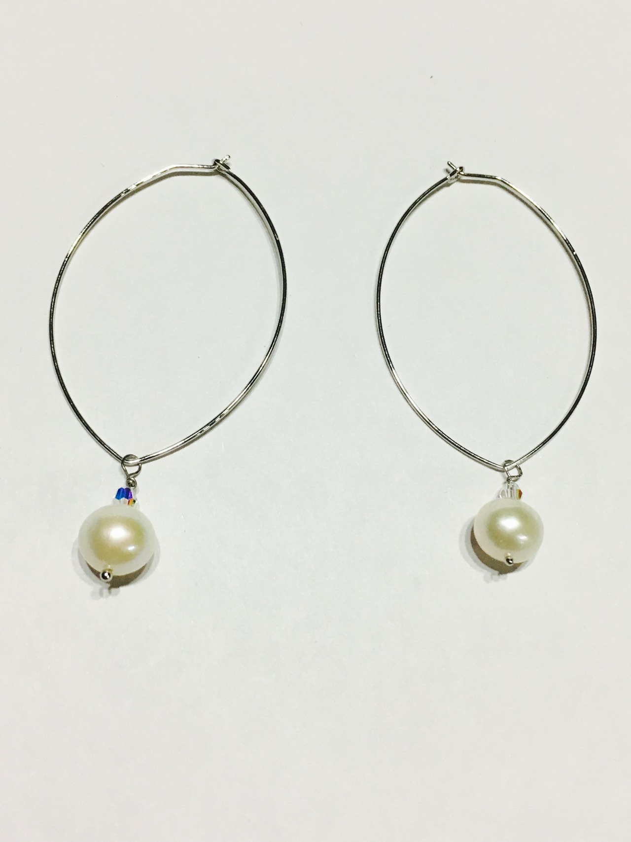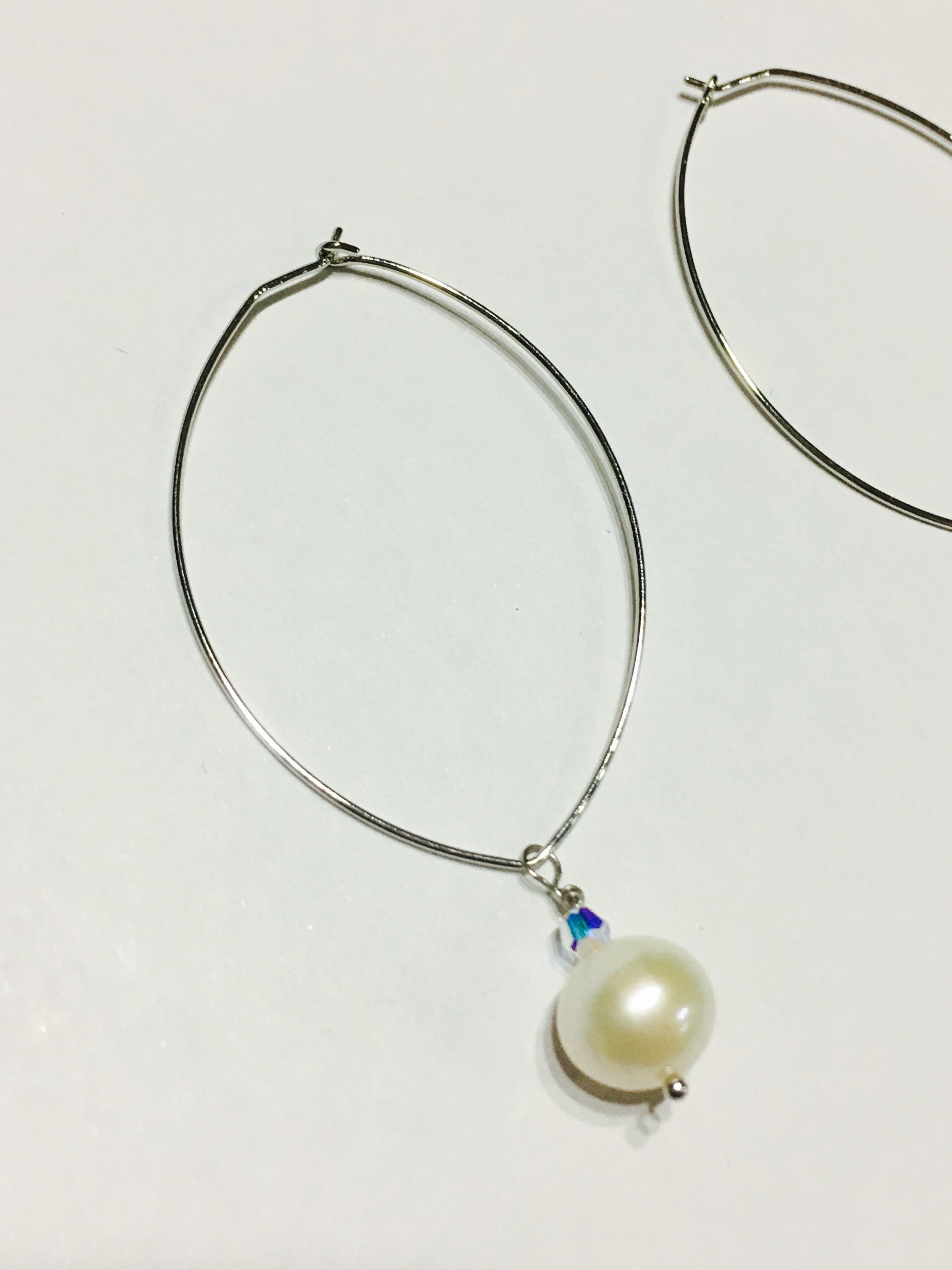 オリーブ型のフープピアスに淡水パールとスワロフスキーを通しました。