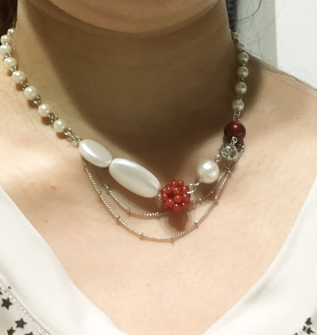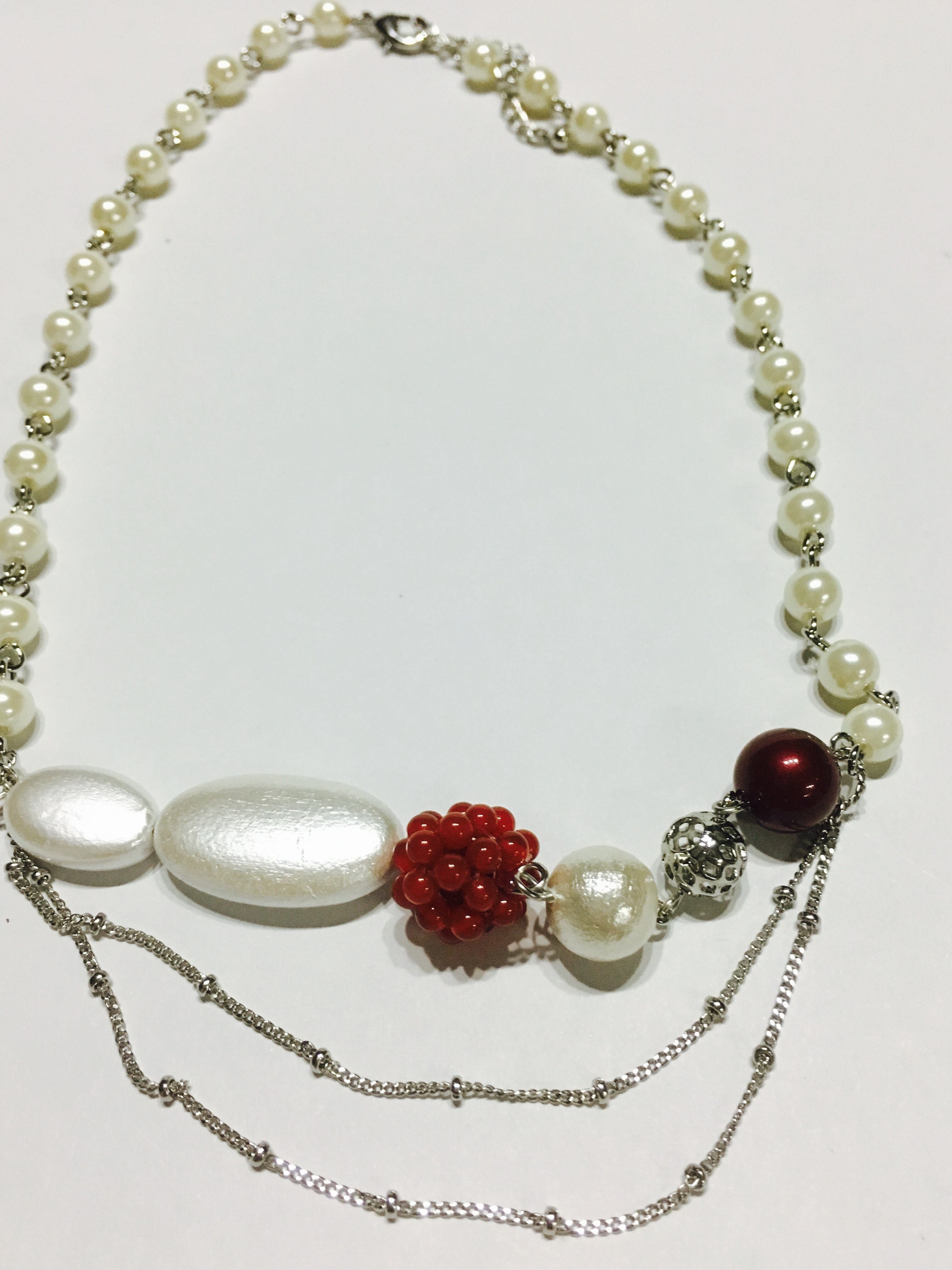 メノウのビーズボールとウッドパール、スワロフスキーパールを組み合わせたデザインネックレスです。長さは約40センチ。アジャスター付き。