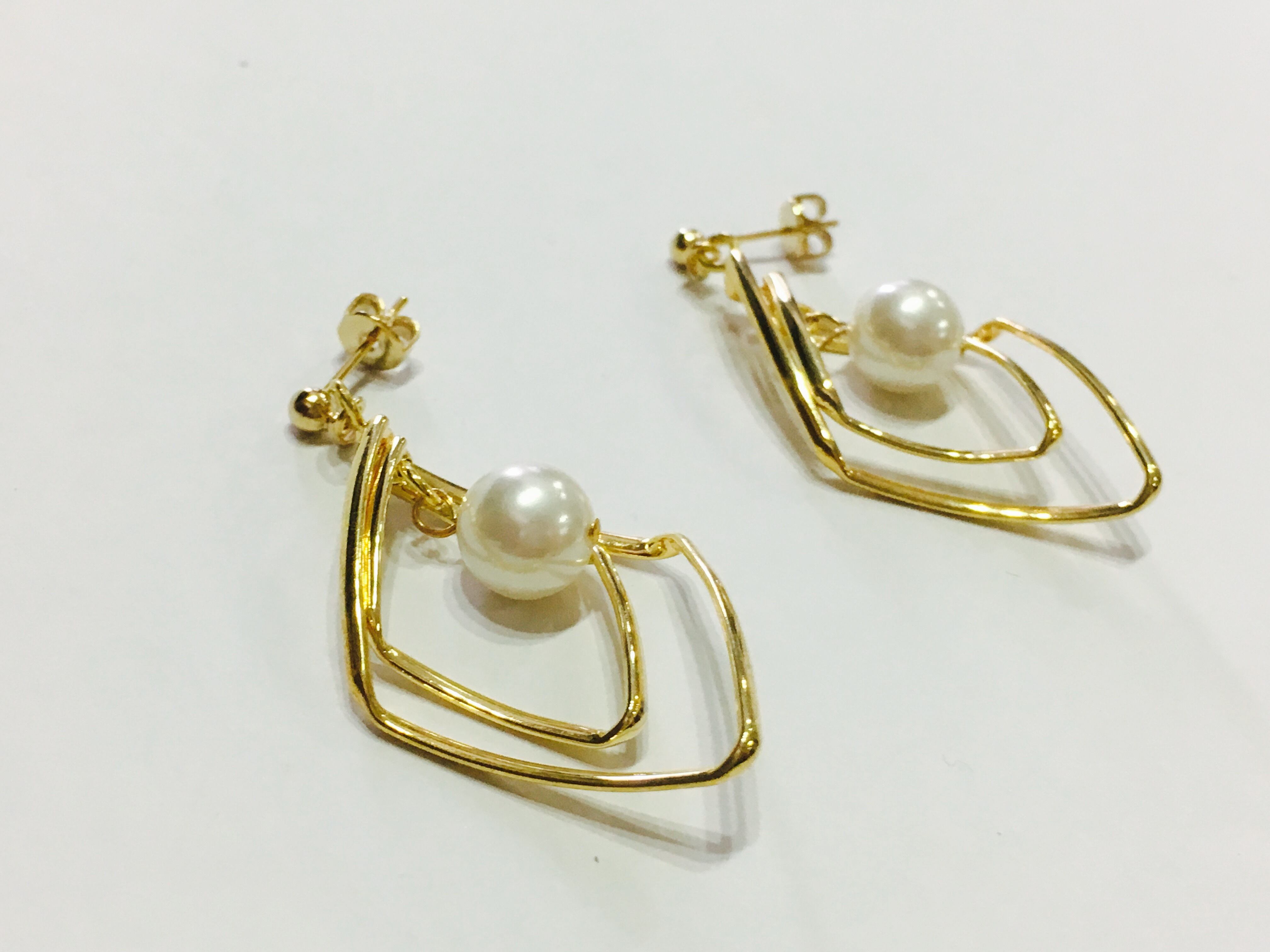 大小のツイストダイヤフレームにパールが揺れるピアス。